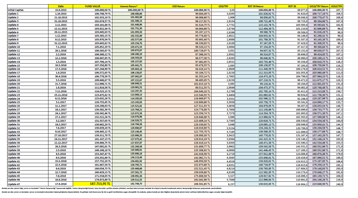 To summarize; Fund return has been beaten by USD/TRY, EUR/TRY, and GOLD/TRY return since inception due to recent depreciation of Turkish Lira.